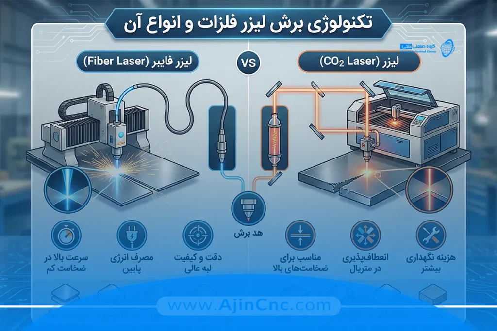 لیزر CO2: تکنولوژی قدیمیتر که مصرف برق بالایی دارد اما در ضخامتهای خیلی بالا لبههای نرمتری ایجاد میکند.